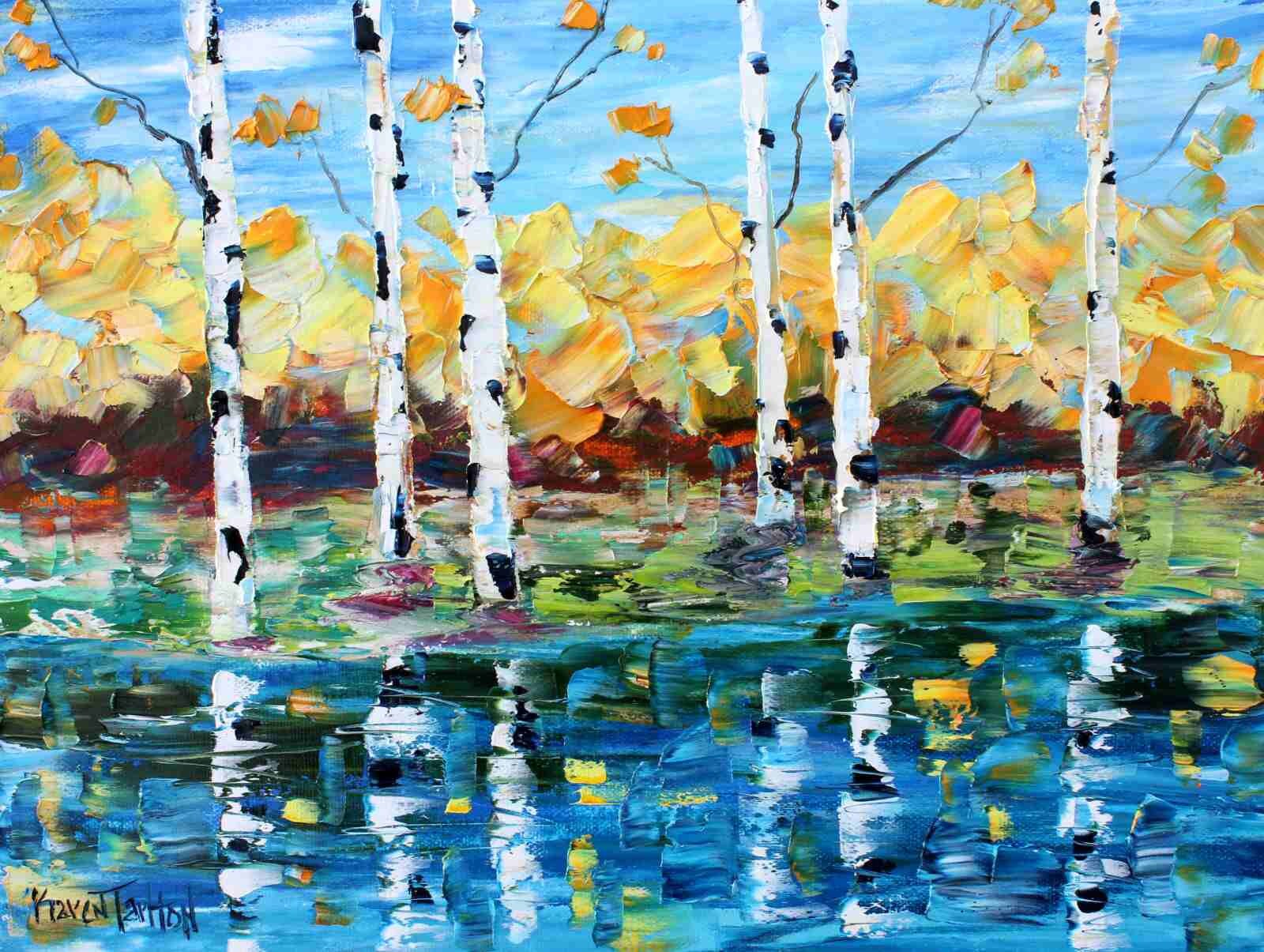 Birch Tree Relections Original oil painting by Karen’s Fine Art – Gallery Represented Modern Impressionism in oils impasto canvas painting on gallery wrapped canvas.