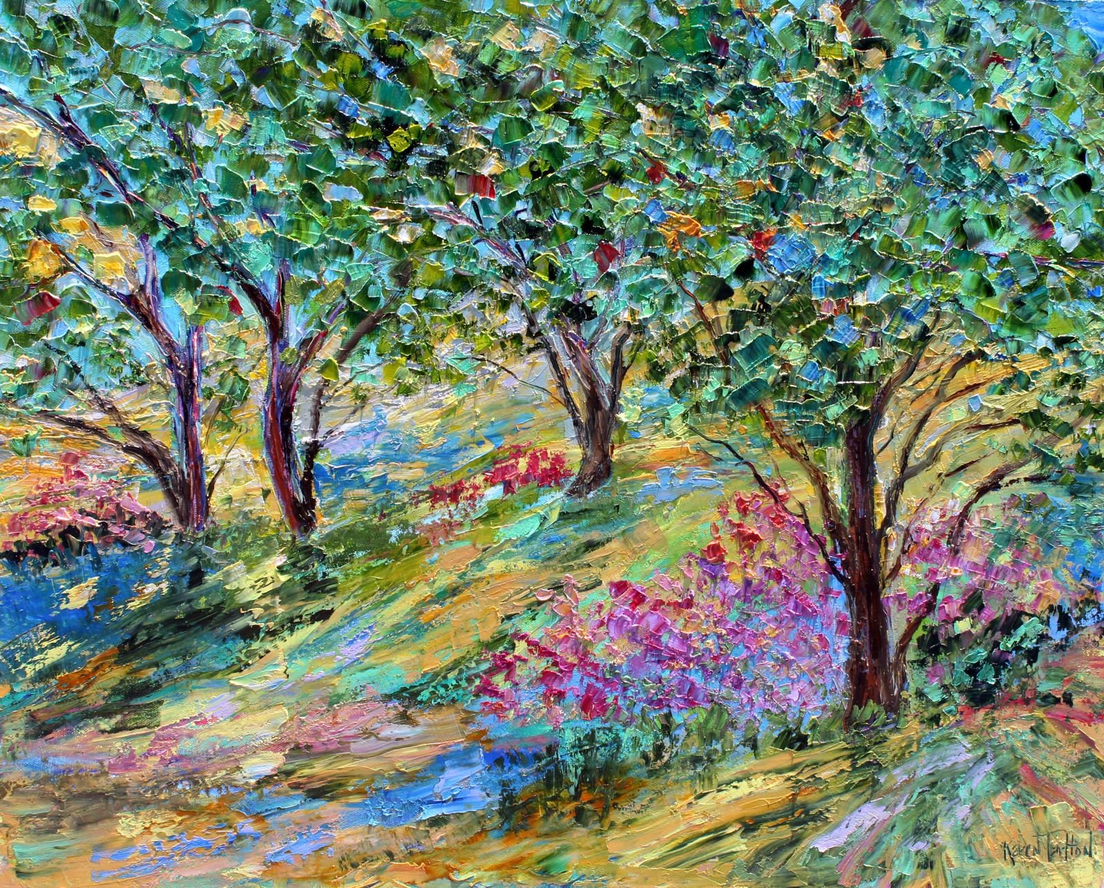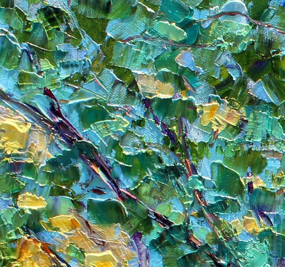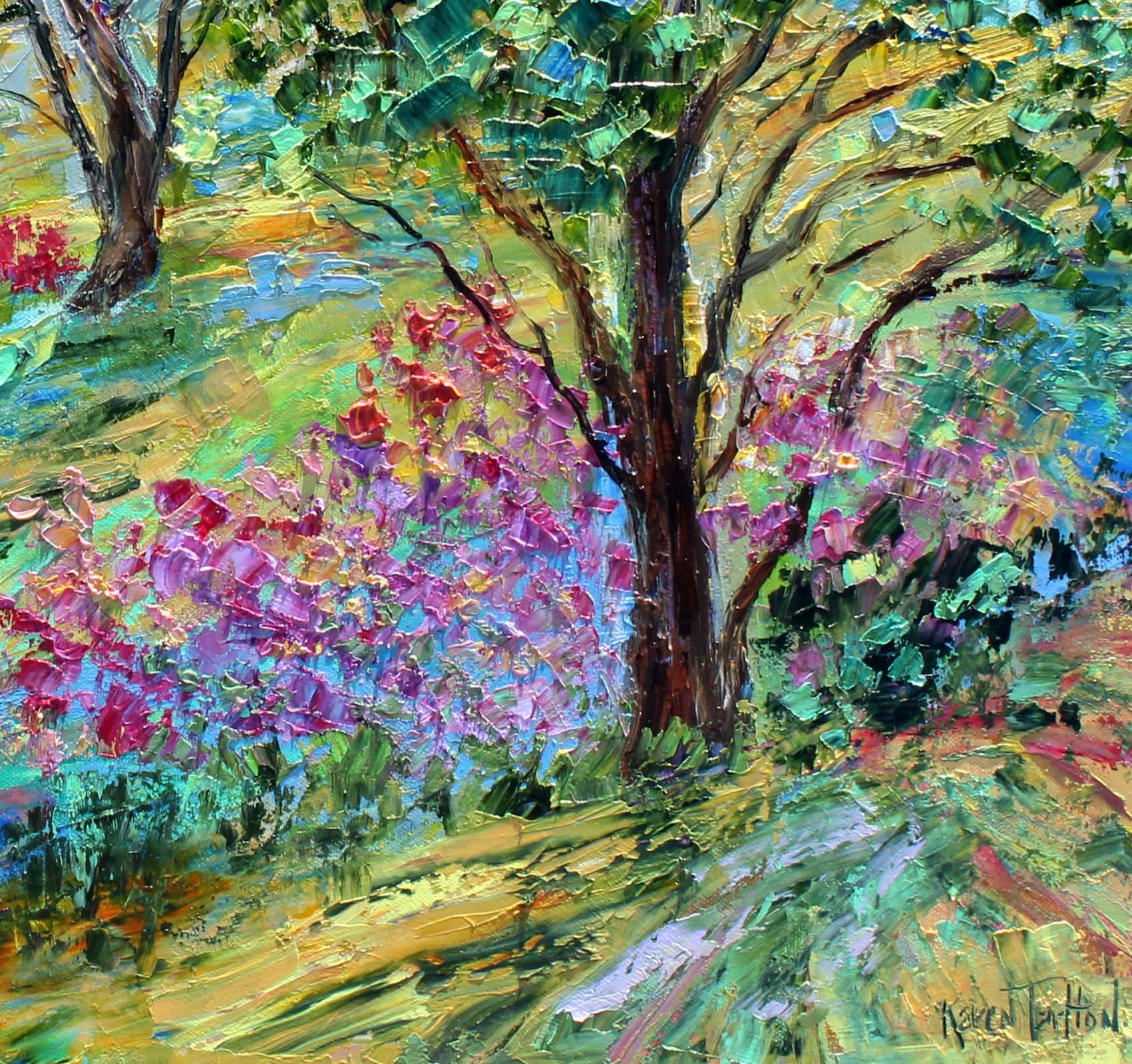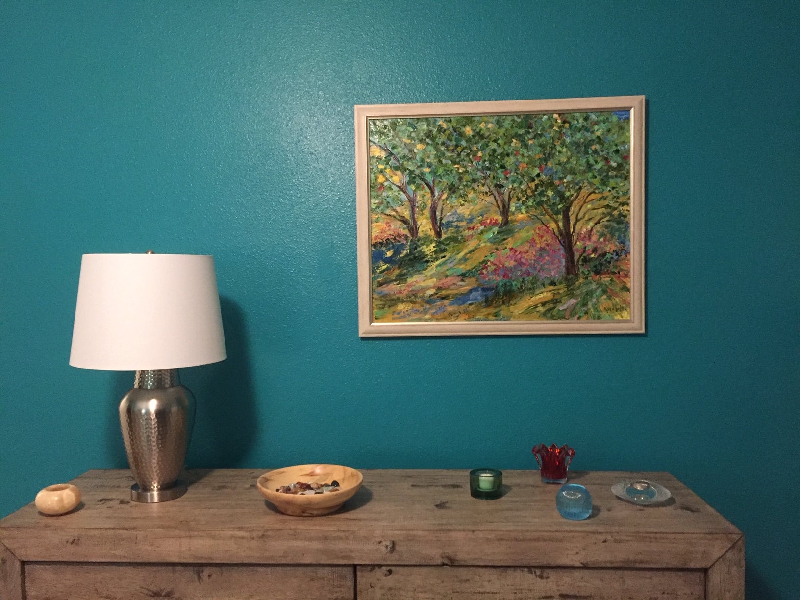 Was strolling through Karen's shop after having been delighted with a painting I'd bought from her a month or so earlier. No intention of buying. Couldn't afford another painting. Didn't have the wall space. And then I saw this. Could not get to my credit cards fast enough. Painting that was going there got reassigned. Love looking at all those gorgeous colors. Thank you, Karen!
