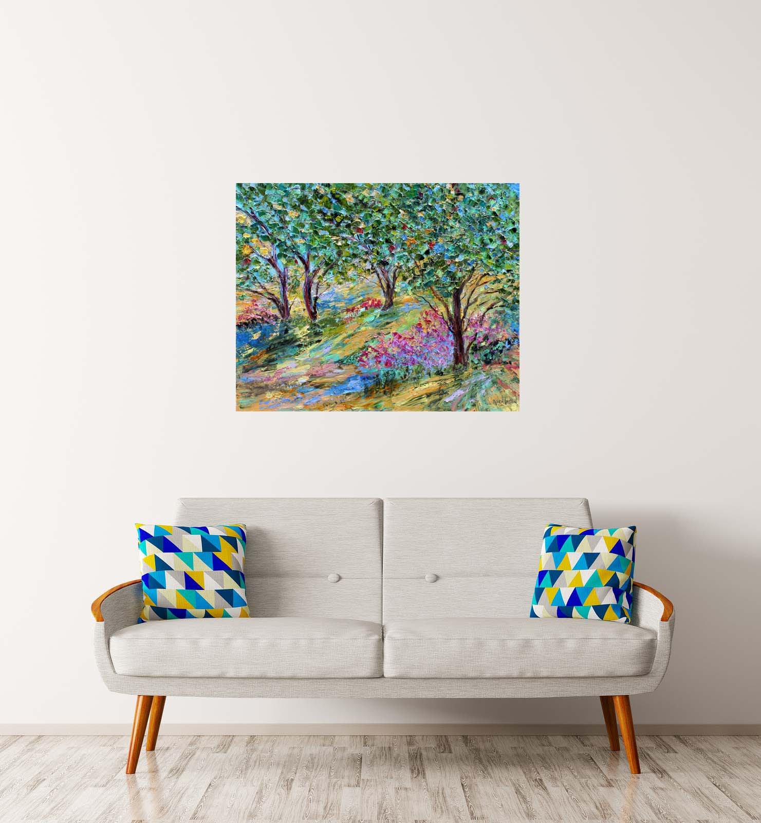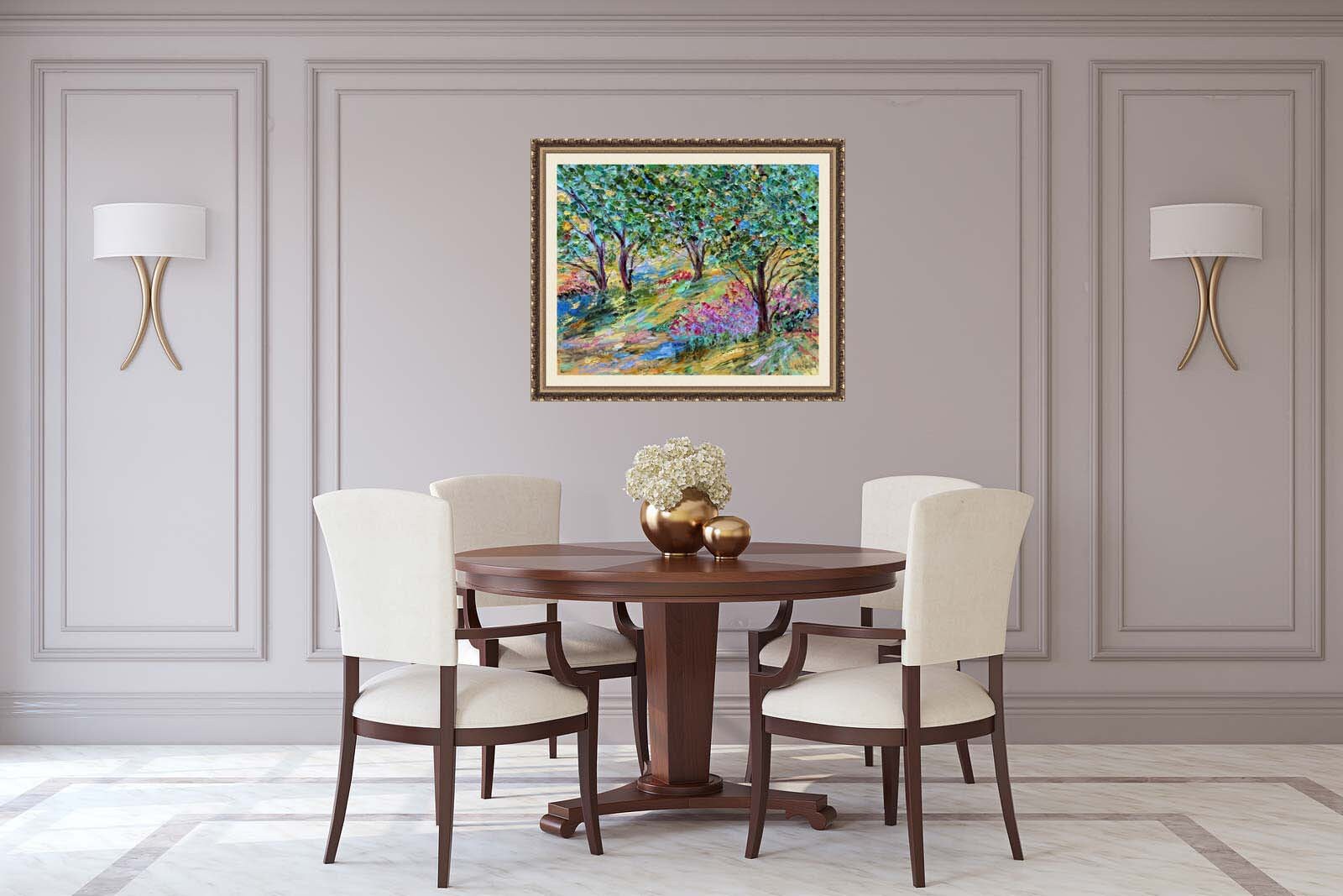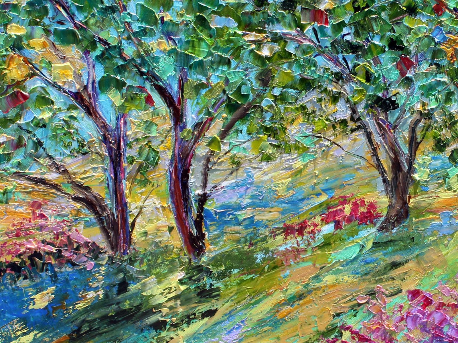 Was strolling through Karen's shop after having been delighted with a painting I'd bought from her a month or so earlier. No intention of buying. Couldn't afford another painting. Didn't have the wall space. And then I saw this. Could not get to my credit cards fast enough. Painting that was going there got reassigned. Love looking at all those gorgeous colors. Thank you, Karen!